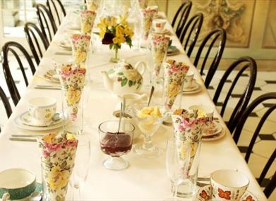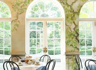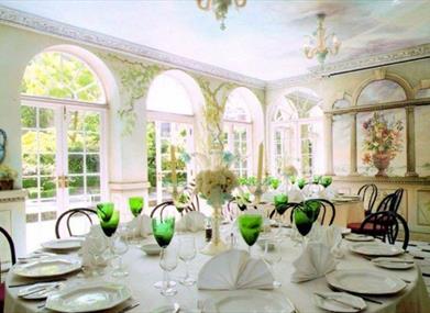 The Orangery, decorated with a mural by Jane Barraclough, boasts a wonderful bright and airy atmosphere. It overlooks what is surely one of the most unexpected and unusual gardens in south London with its paved parterre and fan shaped flower beds, stream and architectural features and plantings in the Japanese manner.