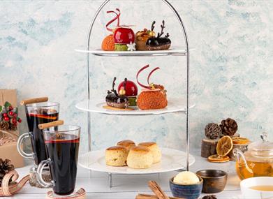 Enjoy a selection of carefully-chosen savoury and sweet treats with spiced cranberry and plain scones served with fig and strawberry preserve and Cornish clotted cream.